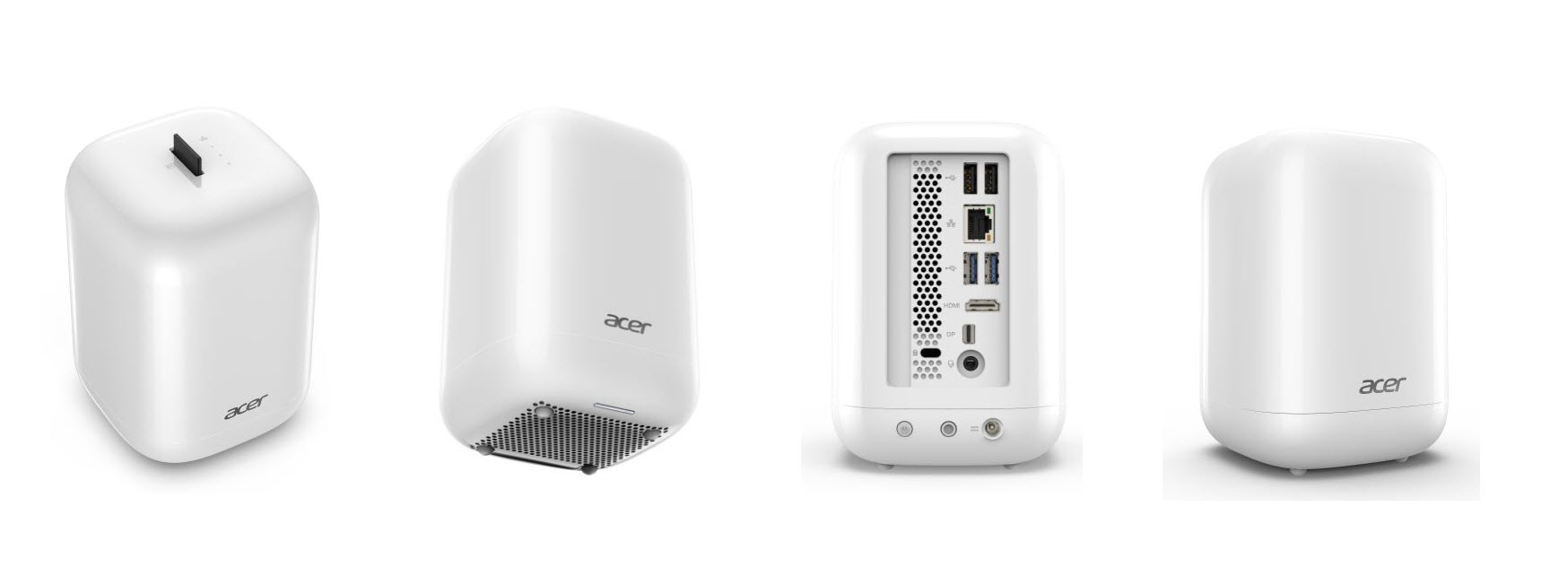 Le design est assez rondouillard et sera disponible en noir ou en blanc. Le REVO One intègre d’origine un disque dur de 2 To, tandis que deux autre emplacements sont prévus pour y loger deux autre disques 2.5 pouces de 2 To chacun. On le voit, ACER ne fait pas dans le détail. Bien.