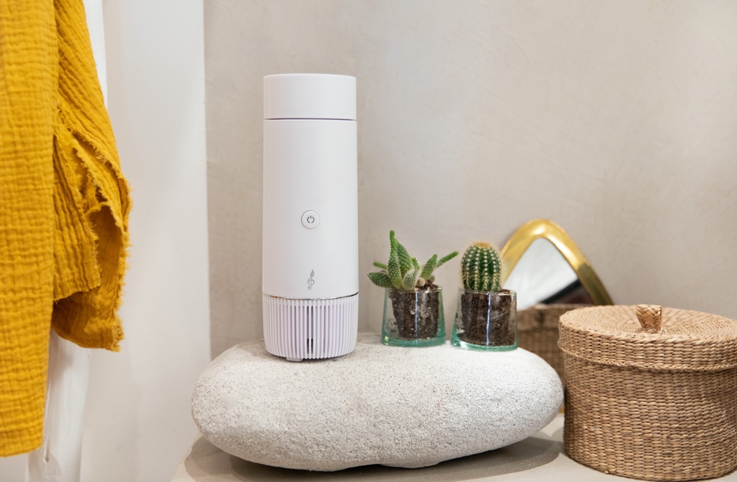Aromasound® dispose aussi d’une gamme de produits nomades pour profiter de la diffusion d’huiles essentielles en tous lieux. Au cœur du système, Nebia est un diffuseur de petite taille qui se branche directement sur une prise USB, par exemple à un ordinateur portable ou dans la voiture. Sa fiche USB articulée permet de l’orienter facilement. Son utilisation mobile se fait sans aucun risque car le diffuseur fonctionne sans eau dans tous les environnements, permettant de parfumer une pièce jusqu’à 30 m².