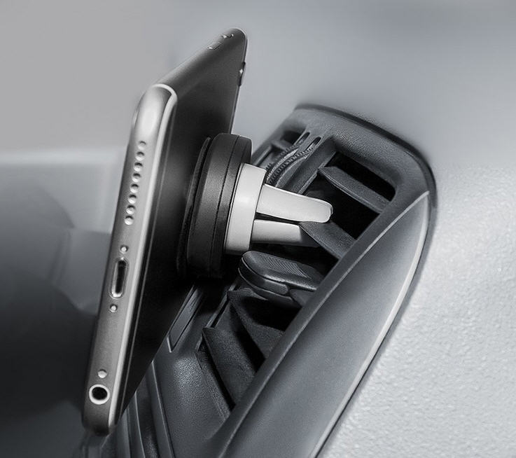 - Placer le support aimanté sur la grille d’aération du tableau de bord