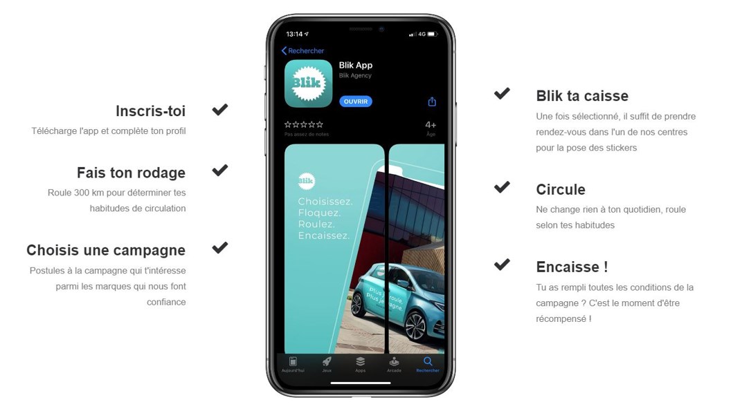 Posés et enlevés par des poseurs professionnels… ces stickers permettent à la marque d’être visible auprès d’un maximum de public. Pour chaque Bliker, il suffit simplement de rouler avec son véhicule selon ses habitudes pour gagner de 100 à 150 € en bons d’achat par mois. Alors envie de faire partie des Blikers ? Rendez-vous immédiat sur l’appli iOS & Android.