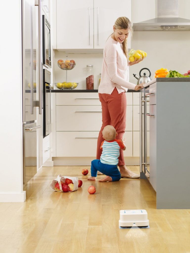 A noter que ce Braava Jet se pilote grâce à votre smartphone : Lancer et arrêter le cube ou encore lui demander de s’attaquer à une série de taches bien profondes et collantes sur le parquet de la chambre du petit qui a laissé sécher 30 grammes de confiture de framboise sur son parquet… sans oublier le gobelet de grenadine répandu à côté.