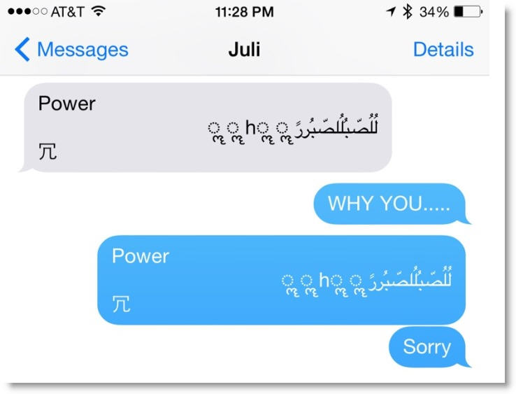 Un nouveau bug dans l’application iOS Messages a été découvert, causant le plantage et redémarrage de l’iPhone à la réception d’un SMS contenant une chaîne de caractères particulière: “Power لُلُصّبُلُلصّبُررً ॣ ॣh ॣ ॣ 冗.”