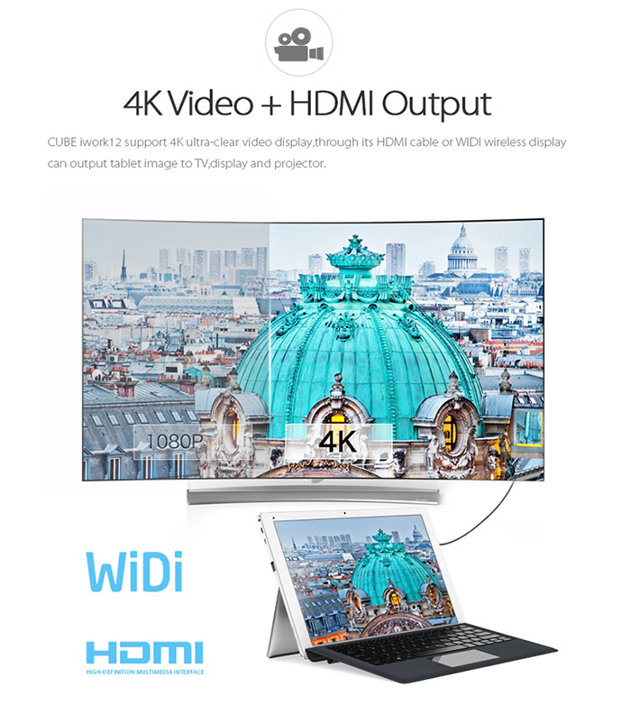 La Cube iwork est équipée de deux appareils photos : 5 Mpixels et 2 Mpixels, ainsi que d’un port HDMI pour la connecter sur la TV et d’un port microSD capable d’accueillir jusqu’à 128 Go de mémoire complémentaire.