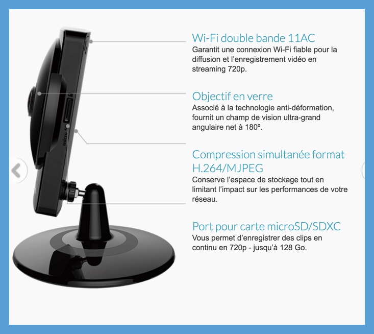D-Link, acteur bien connu dans le domaine, vient de sortir, sous le doux nom de DCS-960L, une caméra qui couvre un angle de 180 degrés. Affichant une résolution de 720p et disposant d’une vision nocturne à 5 mètres, cette caméra peut évidemment être gérée à distance depuis l’application D-Link ou depuis n’importe quel ordinateur.
