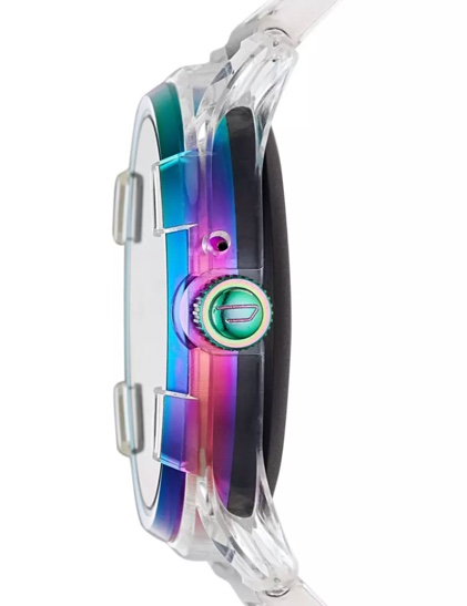 Le premier détail de design remarquable est le bracelet transparent. Disponible en quatre combinaisons de couleurs (rouge et noir, noir et transparent, bleu et transparent, et entièrement transparent avec un boîtier irisé), les couleurs semblent se fondre, d’où le nom de la montre (se fondre se traduit par « fade » en anglais). Les bracelets, qui arborent le logo Diesel estampillé, sont respirants et extrêmement confortables.