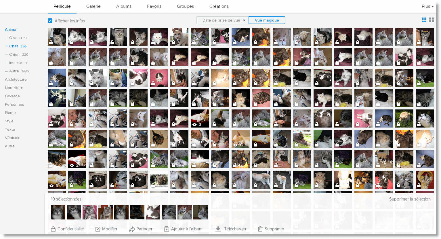 Du côté de l’interface Flickr, la venue de son tout nouveau module “Pellicule” est vraiment bien pensé. Il vous permet de réorganiser rapidement ce qui a été envoyé : Déplacer, supprimer, modifier les dates de prises de vue, télécharger un ensemble de photo mais aussi de partager un album ou une série de photos avec vos amis, un groupe de personnes ou simplement en leur fournissant une adresse (URL). Bref, c’est drôlement utile et, pour ma part, devenu totalement indispensable. Un module “Vue magique” est même disponible : Il est capable de détecter le type de photo et de les classer automatiquement : Chat, chien, paysage, plage, personne, plante, montagne, véhicule, etc. A part cela, toutes vos photos sont automatiquement classées par date de prise de vue et, si vos photos étaient classées dans un répertoire sur votre ordinateur, celles-ci seront intégrée dans un album portant le même nom que ce répertoire.