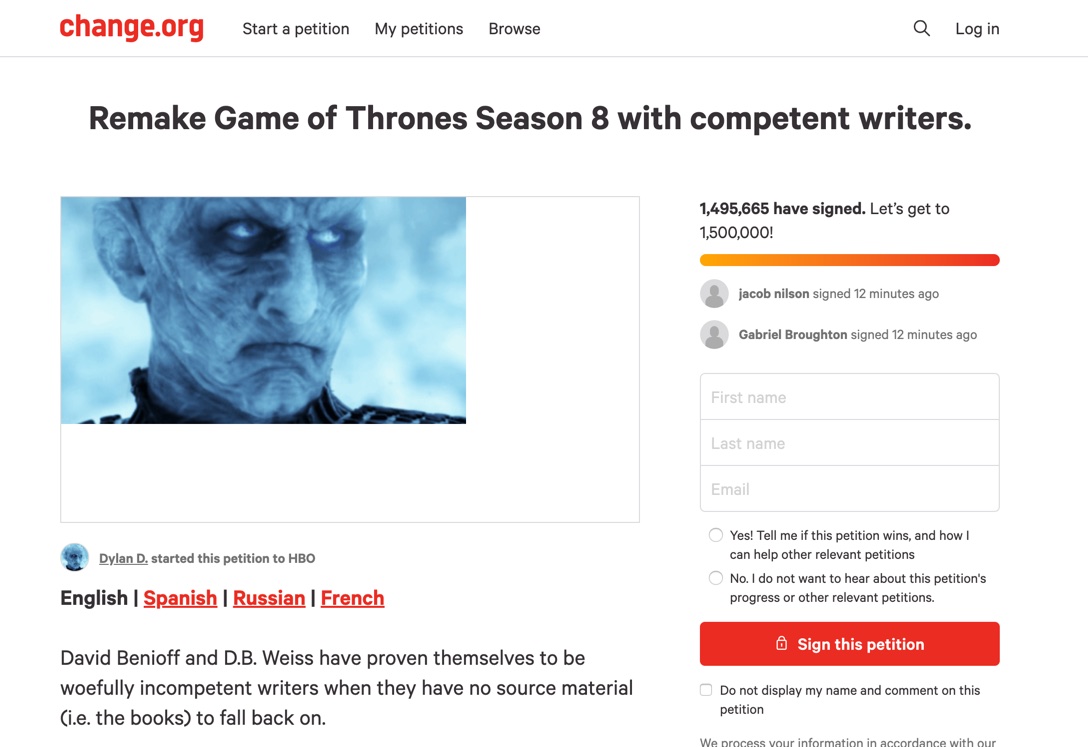 Bref, une pétition a donc été créée pour que les “showrunners” David Benioff and D.B. Weiss prennent en main le bazar à l’aide de véritables scénaristes afin de retourner complètement la saison 8. Au début, on en rigolait un peu mais cette pétition, destinée à HBO, rassemble maintenant plus d’un 1.5 millions de personnes. Bon, à l’heure d’écrire ces lignes, il en manque encore quelques milliers, mais cela ne pourrait tarder.