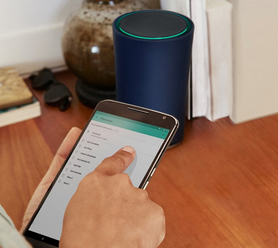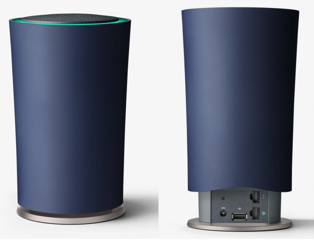C’est pour cela que Google a construit, en partenariat avec TP-Link, un routeur au look assez bien conçu. Il ressemble à un cylindre bleu aux bords verts et se veut donc sobre… et de bon gout. Il supporte les normes 802.11a/b/g/n et ac, mais aussi les normes Bluetooth Smart Ready, 802.15.4 et Weave. Il propose d’emblée 4 Go de stockage pour accueillir les différents micro-programmes qui seront mis à jour de manière transparente. Un léger halo de lumière vous indique d’ailleurs l’état de connexion du routeur.