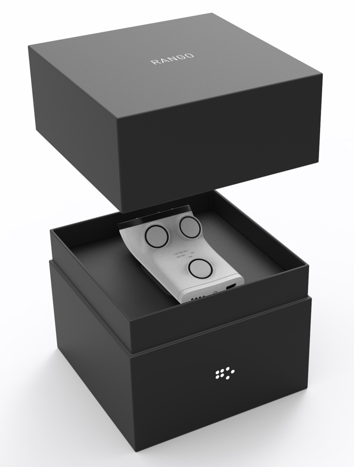 Rango : un petit boîtier électronique intelligent qui est connecté en Bluetooth au smartphone de l’utilisateur et à son application mobile dédiée. Rango se fixe sur tout type de cannes blanches. Doté d’un système de détection révolutionnaire par ultrason qui protège tout le corps, Rango détecte les obstacles présents sur le chemin de l’utilisateur (jusqu’à 2m50), et l’alerte uniquement s’ils constituent un danger sur le parcours, c’est-à-dire s’il y a un risque de collision.