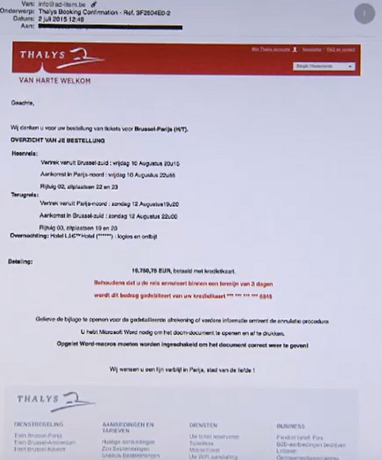 Le gouvernement de la région flamande a donc réalisé un test grandeur nature pour vérifier si ses fonctionnaires ne tombaient pas dans le panneau. Des milliers d’employés (20.000 personnes !) ont donc reçu un email qui faisait froid dans le dos en leur confirmant qu’ils avaient réservé un voyage Thalys Bruxelles-Paris accompagné d’un séjour dans un hôtel grand luxe de la capitale française. Coût facturé : 19.750€ ! La solution proposée pour annuler rapidement la commande : Fournir ses coordonnées bancaires à Thalys dans les plus brefs délais. Si l’annulation n’était pas reçue dans les trois jours, le montant serait irrémédiablement débité du compte de la personne.