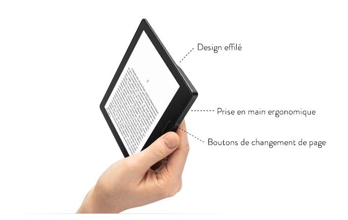 Il s’agit toujours d’un Kindle de 6 pouces, offrant une résolution de 300 ppp afin disposer d’un confort de lecture optimal. Mais la grande nouveauté est bien dans son design effilé, ponctué d’une ergonomie sortant des sentiers battus.