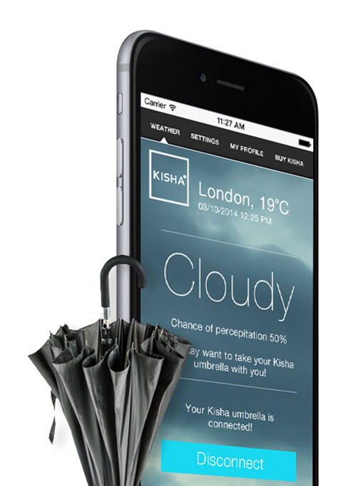 Kisha est un parapluie qui se connecte via Bluetooth à votre Smartphone. Son principe est assez simple, une fois relié, votre smartphone vous avertira dès que vous vous éloignez de quelques mètres du parapluie. Si, malgré tout, vous le perdez, votre téléphone pourra vous indiquer sa dernière position avant que vous ne l’ayez perdu. Simple.