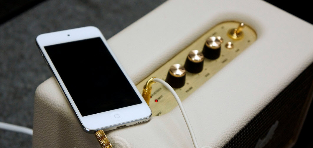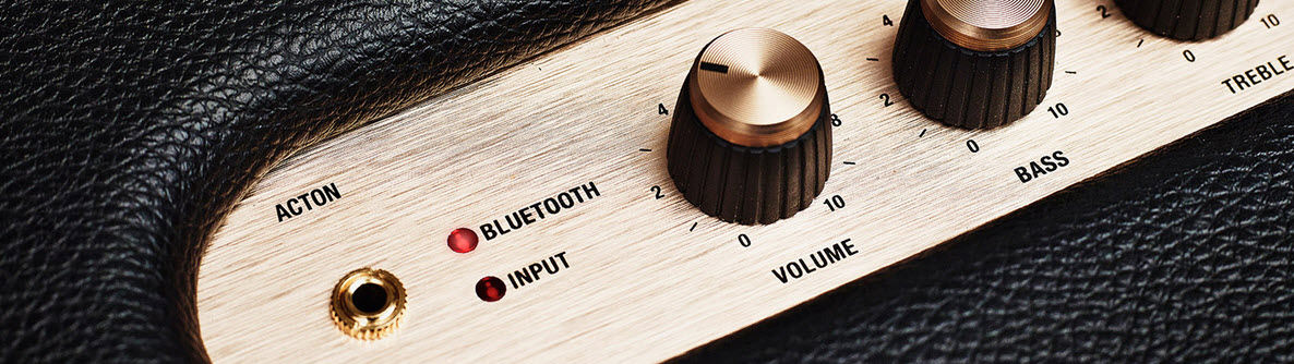 Enfin, la face supérieure dorée comporte  le réglage du volume, des basses et des aigus via des potentiomètres bien classiques ainsi que deux boutons permettant de sélectionner la source sans oublier un bon gros commutateur pour la mise sous tension.  Evidemment, l’Acton propose le Bluetooth 4.0 et possède une entrée  mini-jack 3,5 mm fournie avec un câble torsadé bien pratique.