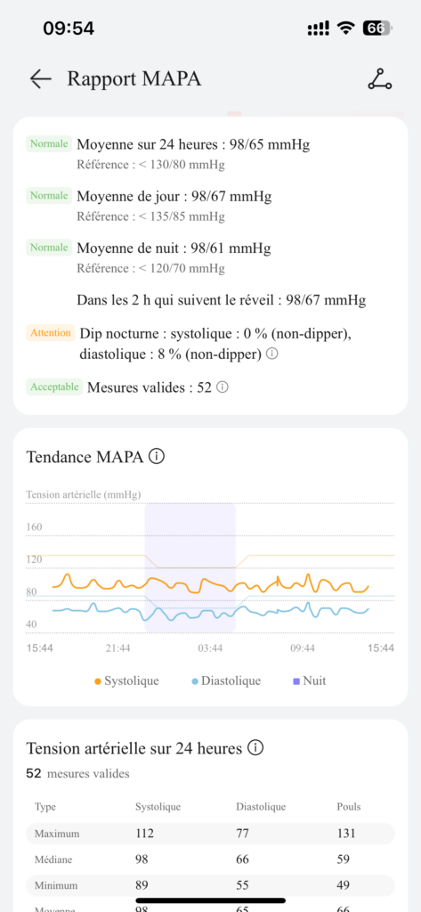 La fonction qui m’intéressait le plus était le MAPA (Mesure Ambulatoire de la Pression Artérielle). Il permet un suivi sur 24h avec des relevés toutes les 15, 30 ou 60 minutes. J’ai opté pour 30 minutes… et j’ai vite réalisé que ça passe très vite ! Heureusement, j’étais chez moi, car chaque mesure impose de s’immobiliser et de ne pas parler (un vrai challenge pour moi).