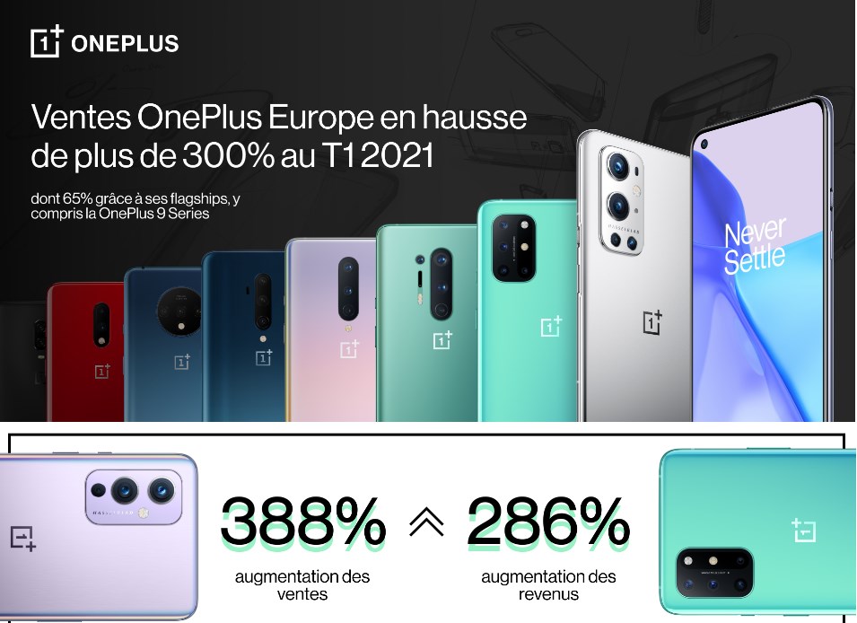 OnePlus a annoncé un très bon début d’année 2021, avec une augmentation substantielle de 388% des ventes et une augmentation de 286% des revenus au premier trimestre 2021, par rapport au même trimestre de l’année dernière. Cette croissance est largement dûe à ses gammes de flagships, dont la OnePlus 9 Series, qui contribuent à 65% au chiffre d’affaires global.
