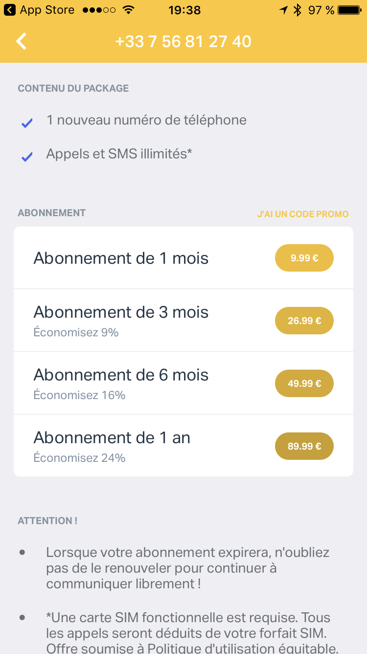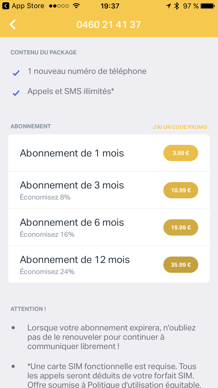 Enfin, sachez que vous pouvez acheter autant de numéros que vous le souhaitez et arrêter l’abonnement quand vous le désirez. Un voyage en France ? Envie d’être joignable durant un mois par votre nouvelle amie qui pourrait devenir plus qu’une amie ? Le tour est joué ! Je ne vous explique pas en détail, vous aurez compris tous les avantages de ce système. De plus, il est possible d’activer/désactiver à tout moment (onoff) chacun des numéros et, bonne nouvelle, il vous suffira de l’installer sur n’importe quel téléphone (si votre batterie est à plat) pour vous retrouver avec tous vos contacts sur le smartphone de votre vieux pote de beuverie afin de profiter de son forfait à lui.