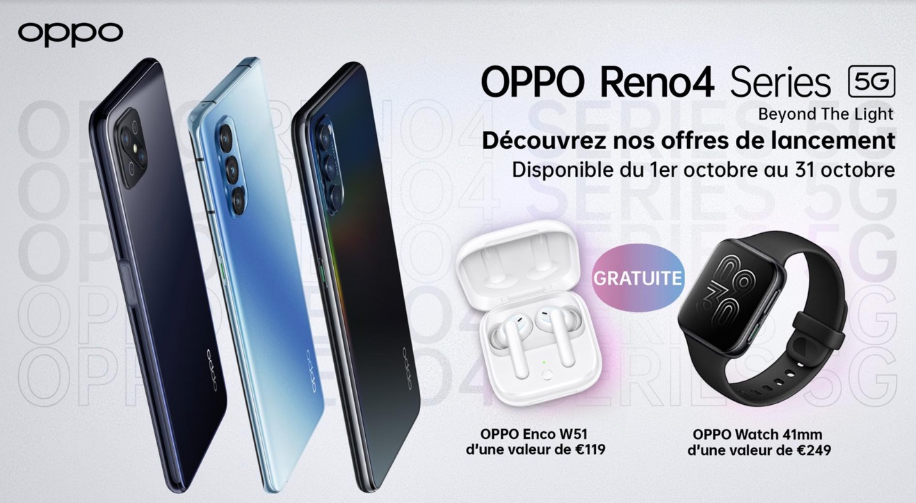 La série Reno4 d’OPPO sera disponible à partir du 8 octobre en magasin. En Belgique, l’offre de lancement inclut, jusqu’au 31 octobre, une OPPO Watch 41mm (d’une valeur de 249€) gratuite à l’achat d’un OPPO Reno4 Pro ou d’un OPPO Reno4, et des écouteurs sans fil OPPO Enco W51 (d’une valeur de 119€) gratuits à l’achat d’un OPPO Reno4 Z.