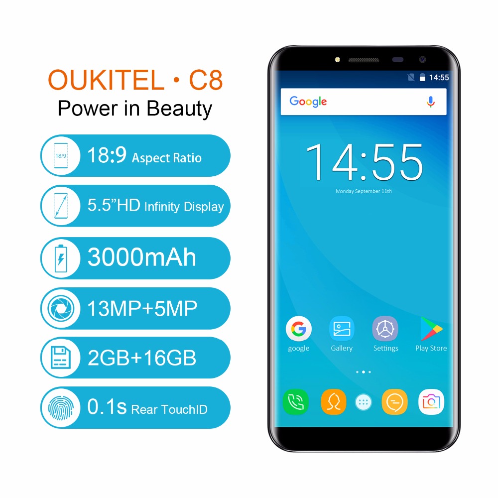 Cet Oukitel C8 propose un grand écran sans bord d’une diagonale de 5.5 pouces disposant d’une résolution HD de 1280×640 pixels. A l’intérieur, nous trouvons un processeur Mediatek MT6737 épaulé par 2 Go de RAM et 16 Go de mémoire de sauvegarde (on ne rigole pas mais, pour un student, ça tiendra le coup), pouvant être augmenté jusqu’à 64 Go via un slot pour carte micro SD.