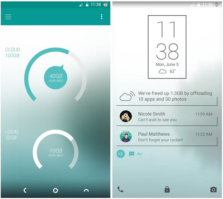 Le principe est novateur : Offrir une capacité de stockage illimitée à leur smartphone : le Robin. Mais comment arrivent-ils à ce résultat ? Et bien, tout simplement en analysant en permanence les applications, musiques, photos et autres fichiers utilisés le plus souvent par l’utilisateur. Tout ce que n’est pas ou peu utilisé est envoyé dans un Cloud dédié au smartphone. Celui-ci offre, gratuitement, une capacité de 100 Go. Si une application ou une photo n’est pas disponible sur le téléphone, elle sera alors grisée et pourra être téléchargée depuis le Cloud.