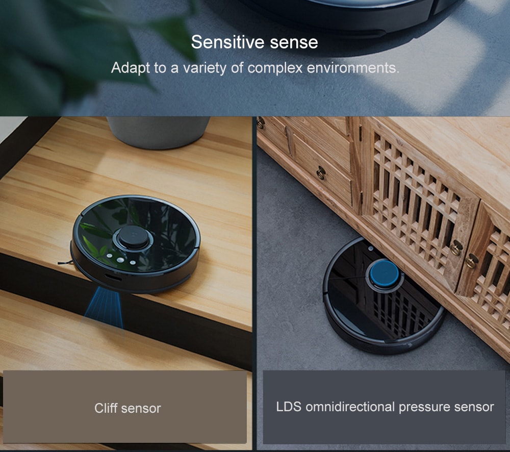 Le capteur principal du Roborock S55 est son Laser Distance Scanner, cette fameuse petite tête ronde située sur le dessus de l’engin,  scanne votre intérieur à 360°(1800 fois par seconde) pour cartographier et mémoriser l’aménagement de votre maison, tout comme les obstacles qui la composent. Bien sûr, si pendant le cycle de nettoyage vous bougez un truc, il s’adaptera sans problème et l’évitera comme par magie.