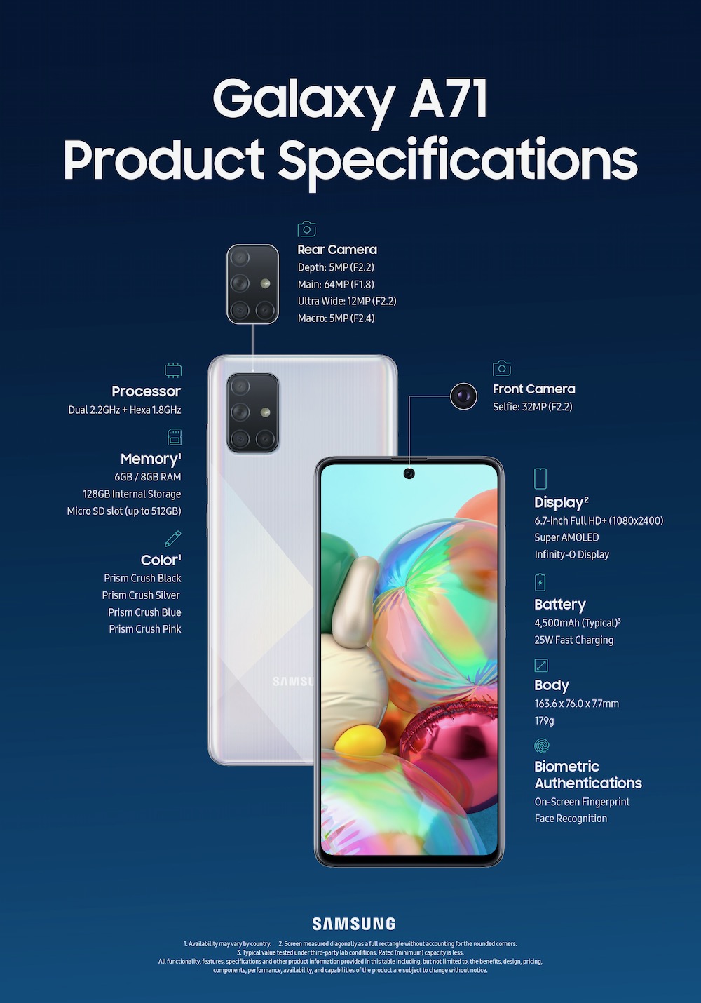 Samsung a dévoilé aujourd’hui les Galaxy A71 et Galaxy A51, les derniers-nés de la famille Galaxy A. Les Galaxy A71 et A51 regorgent de fonctions améliorées et d’innovations : une autonomie de batterie plus élevée pour répondre à toutes les exigences de votre mode de vie, un appareil photo pour immortaliser le monde et un écran Infinity-O pour une expérience visuelle encore plus intense.