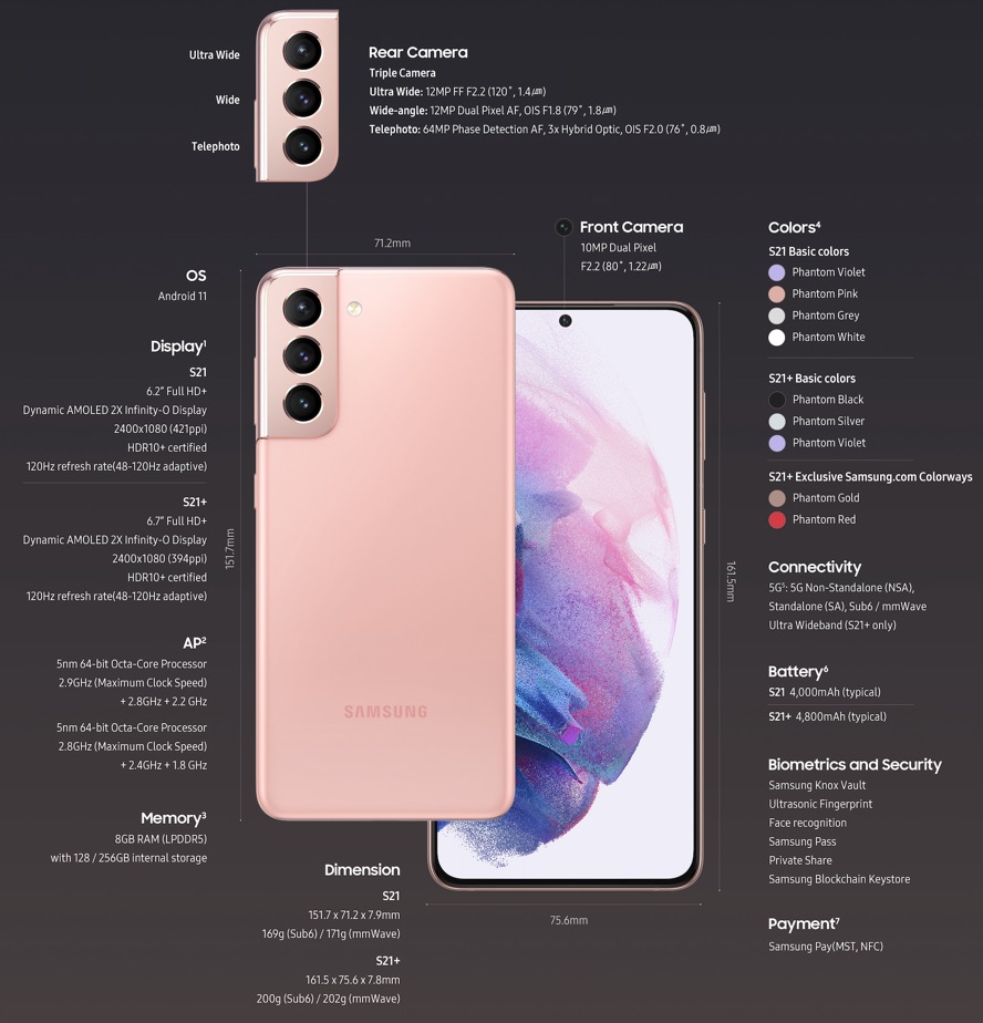 Les Galaxy S21 5G et S21+ 5G seront disponibles à partir du 29 janvier au prix de vente conseillé de 849€ pour le Galaxy S21 5G avec 128 GB de mémoire, et de 899€ pour le Galaxy S21 5G avec 256 GB de mémoire. Le Galaxy S21 5G sera disponible dans les couleurs suivantes : Phantom Violet, Phantom Grey, Phantom Pink et Phantom White.