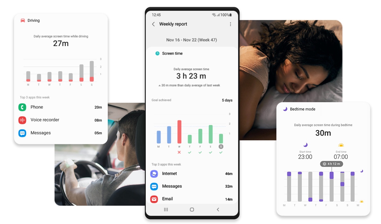 L’interface ONE UI 3 a été conçue pour l’utilisateur et comprend de nouvelles applications de bien-être numérique qui vous aident à cerner et à améliorer vos habitudes numériques. Consultez rapidement les informations d’utilisation qui indiquent l’évolution de la durée hebdomadaire passée devant l’écran ou vérifiez votre utilisation en conduisant pour vous aider à prendre des décisions éclairées sur la manière et le moment d’utiliser vos appareils Galaxy.