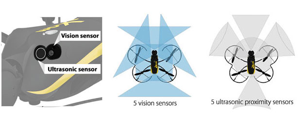 De plus, afin d’éviter les collisions en vol, le drone eXom est équipé de 5 capteurs de proximité à ultra-sons vous permettant d’être informé de la distance entre le drone et les objets environnant (mur, végétation, etc.).