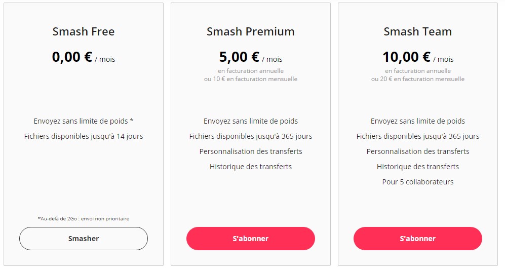 Smash propose également un abonnement payant qui vous permettra de monter en puissance et de rendre les fichiers disponibles durant un an et de bénéficier d’un historique des transferts.