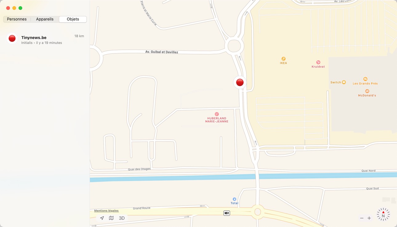 Après ce court intermède, je me lance donc à la recherche de ma femme. Déjà, c’est extrêmement positif : Je lance l’App “Localiser” sur mon MacBook Pro et, sans aucune demande ou action de ma part (et j’insiste bien sur ce point), il m’est indiqué que la dernière localisation a été effectuée il y a 19 minutes, à un endroit précis, près de la sortie d’autoroute qu’elle emprunte pour aller travailler.