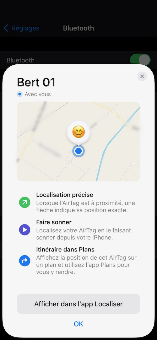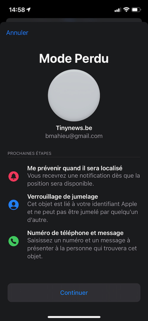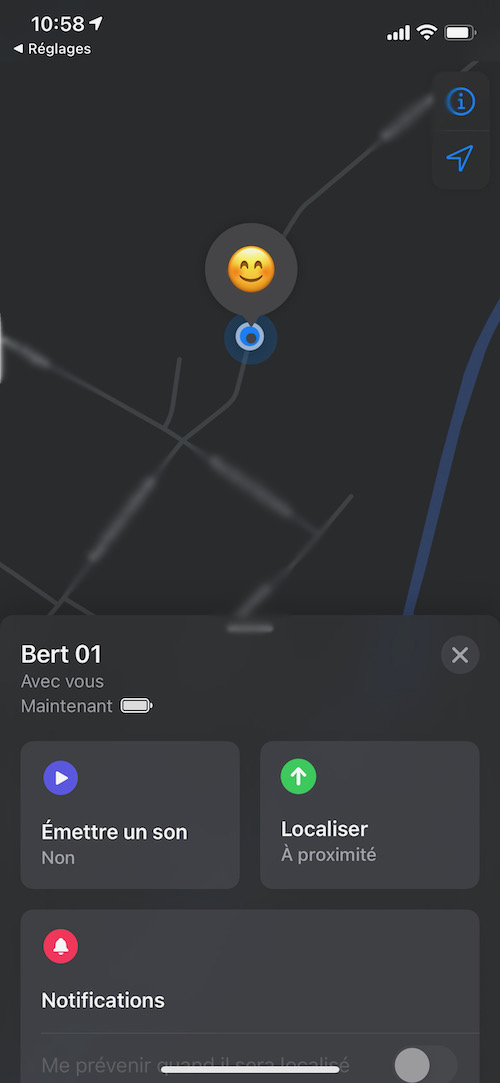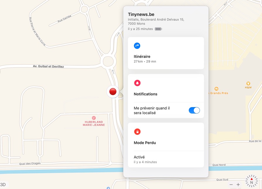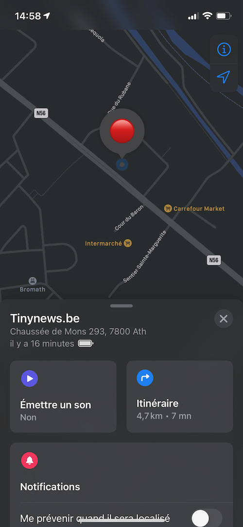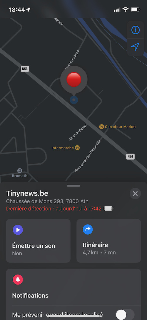 Ensuite, j’active le mode “Perdu” et demande d’être averti dés qu’Apple localise à nouveau l’AirTag afin de vérifier si la localisation s’effectue correctement lors des éventuels déplacements de l’objet. J’ai à peine le temps de placer un “point” à la phrase suivante qu’une nouvelle localisation a été détectée, après vérification, cela correspond bien à son trajet habituel. Merveilleux, ce gadget fonctionne vraiment ! Entre les deux localisation, il s’est donc écoulé une bonne vingtaine de minutes.
