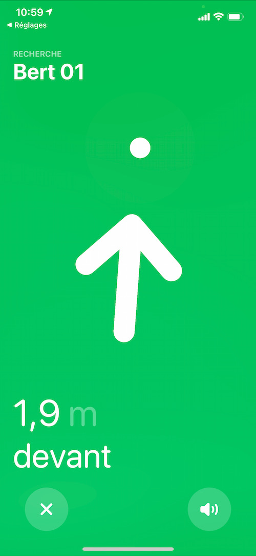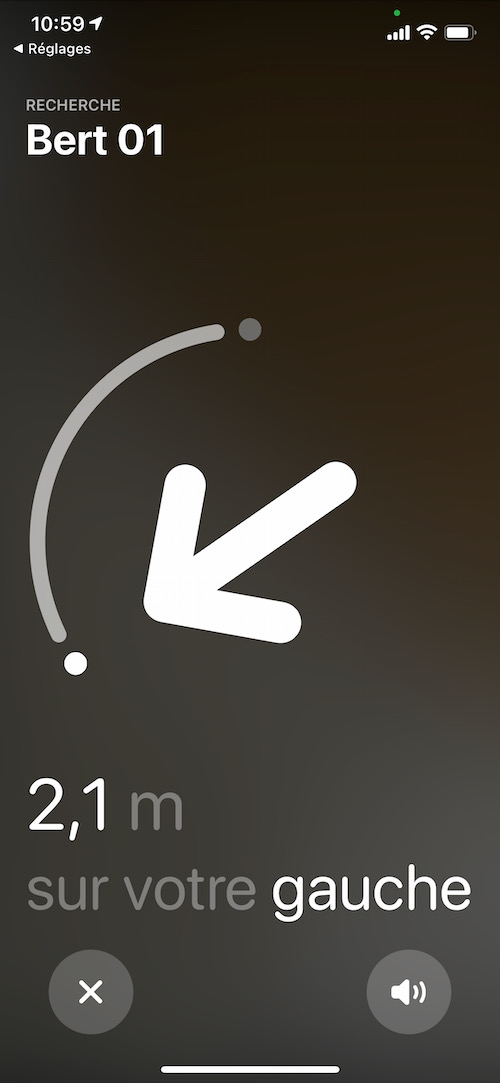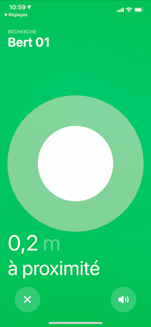 Si vous n’êtes pas friands de jeux de piste, il vous sera possible de “Faire sonner” l’Airtag afin de mieux vous orienter dans l’immeuble. Bon, caché dans le tiroir à chaussettes, le son assez aigu se fait tout de même entendre et facilite grandement la recherche, couplée aux indications de l’App. C’est assez réussi, simple et intuitif. J’approuve totalement. Petit bémol, si la connexion Bluetooth ou UWB est perdue en fonction de l’éloignement du Airtag, il vous faudra tâtonner en vous déplaçant afin de déclencher la connexion. Je le répète, il s’agit ici d’un device Bluetooth avec tous ses inconvénients au niveau portée, notamment au travers de murs successifs.