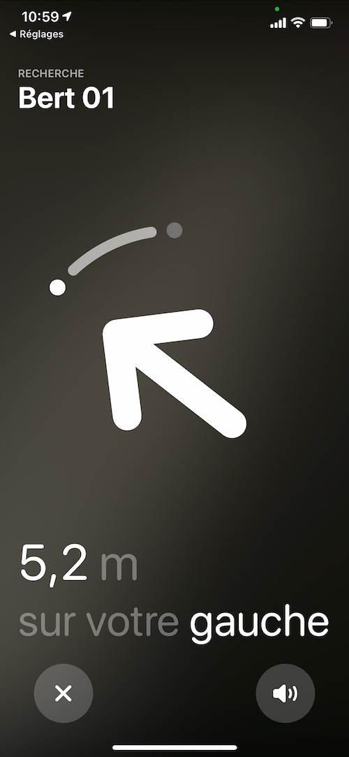 J’ai donc simplement lancé l’App “Localiser” sur mon iPhone et je me suis déplacé dans la maison jusqu’à ce que j’obtienne un signal Bluetooth ou UWB (Ultra Wideband). A partir de ce moment, l’App va vous aider à vous déplacer afin de trouver l’Airtag. Il indique assez finement la distance et, cerise sur la gâteau, la direction à suivre pour atteindre le joyeux Graal.