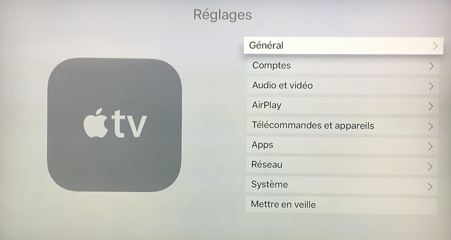 Passé l’étape de l’installation (connexion au modem et à ma non-smart télévision via un câble HDMI – non-fourni !), je découvre rapidement une interface intuitive et familière pourvues d’applications tvOS et j’appréhende sans difficulté l’Apple TV Remote avec sa Surface Touch, en verre s’il vous plaît. Je me retrouve ensuite, en tout bon geek que je suis, dans le menu Réglages afin d’ajuster les différents paramètres à mon environnement.