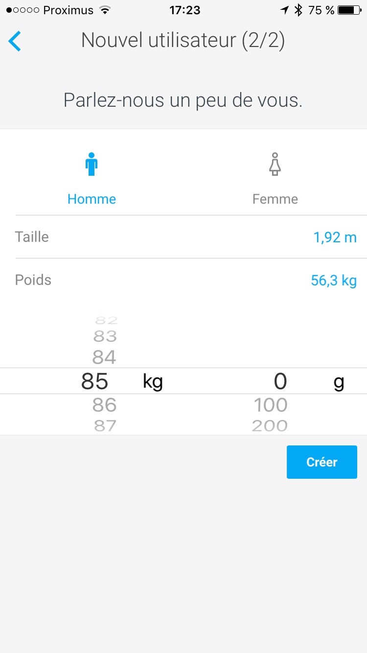 Les différentes étapes sont des plus simples et intelligemment proposées : Installer l’App, connecter la balance, ouvrir un compte Withings et créer un premier utilisateur : Vous ! Après quelques questions sur votre taille et poids (aucun secret à dévoiler), vous voilà prêt à monter sur votre première balance connectée. C’est merveilleux, votre anxiété retombe déjà et vous vous sentez d’emblée plus léger pour affronter la journée. C’est comme sortir de chez le médecin lorsqu’on a mal au dos : On va déjà mieux quand on l’a vu.