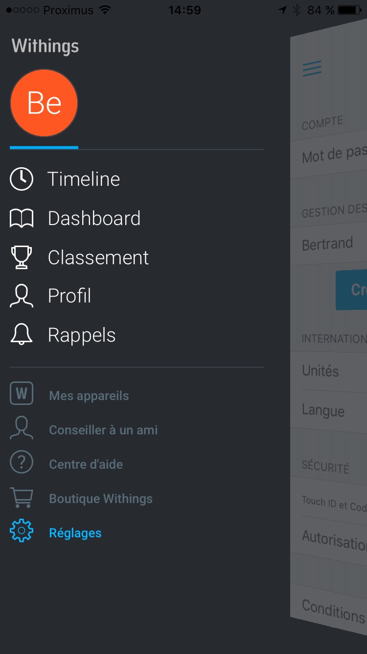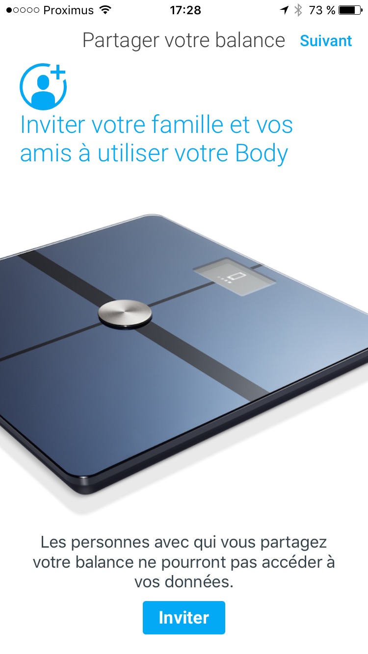 Là où Withings atteint pleinement son objectif est sa capacité à gérer jusqu’à dix utilisateurs pour la même balance (mais pas tous en même temps, comme dirait Coluche). En effet, vous pouvez inviter votre joyeuse petite famille à s’y connecter via un simple mail. J’ai essayé avec ma fille (19 ans) et cela a fonctionné dans les deux minutes. J’ai eu droit à un “Whaouuuu, mais c’est génial ton truc, il me reconnait quand je monte sur la balance !“.
