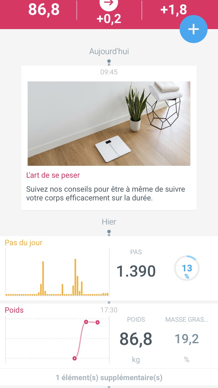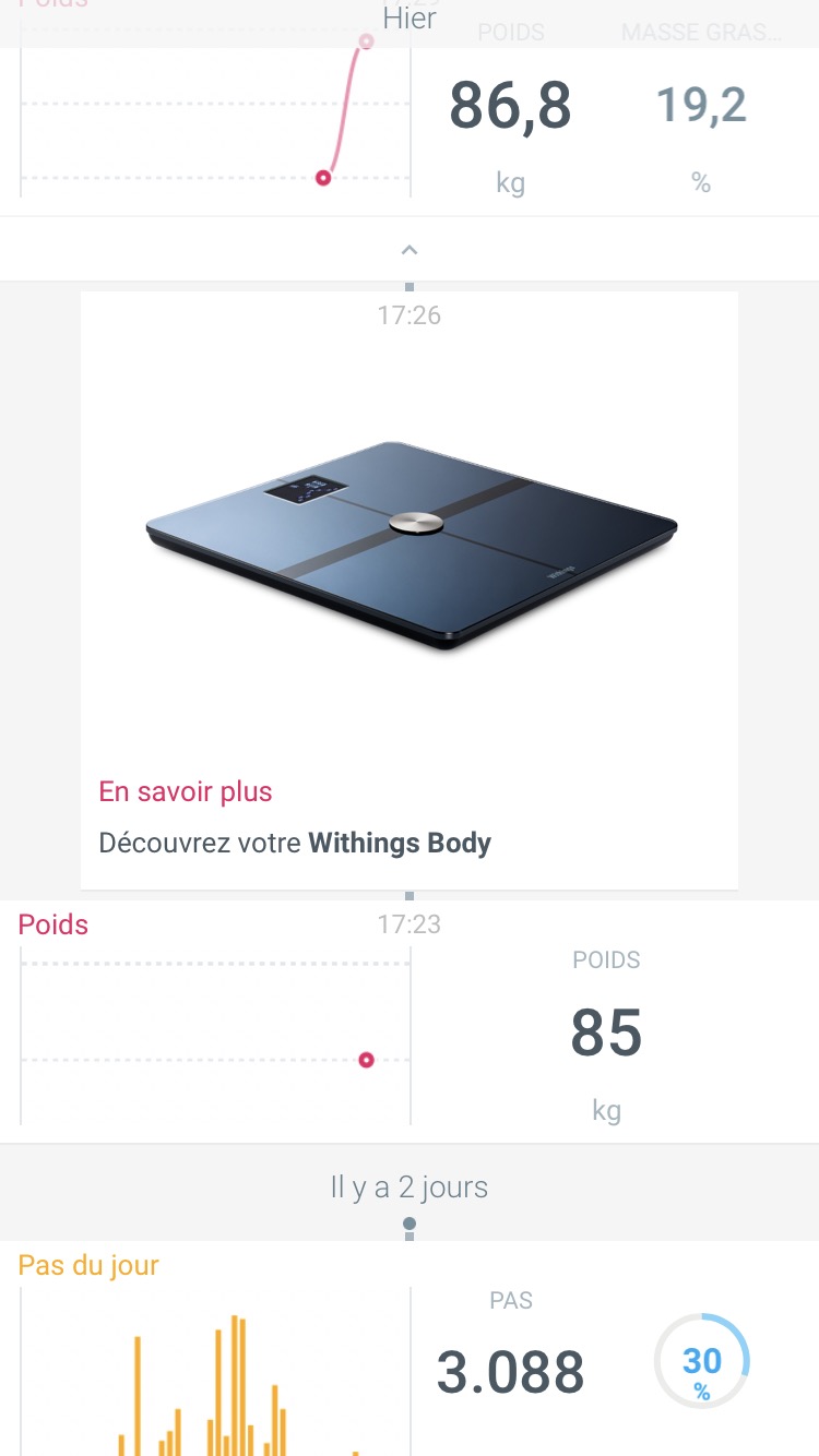 D’autres mesures peuvent aussi être ajoutées au travers d’applications tierces ou de données provenant de votre smartphone, comme le nombre de pas parcourus. Sur mon iPhone, l’App Withings peut donc récupérer les données de l’App “Santé” et les intégrer dans la ligne du temps. Je trouve cela particulièrement judicieux de rassembler tout ce petit monde dans la seul App Withings. Si vous êtes friand de l’App RunKeeper pour vos séances de running, vous pouvez donc utiliser toutes ces données, tout comme le nombre de calories dépensées, par exemple.