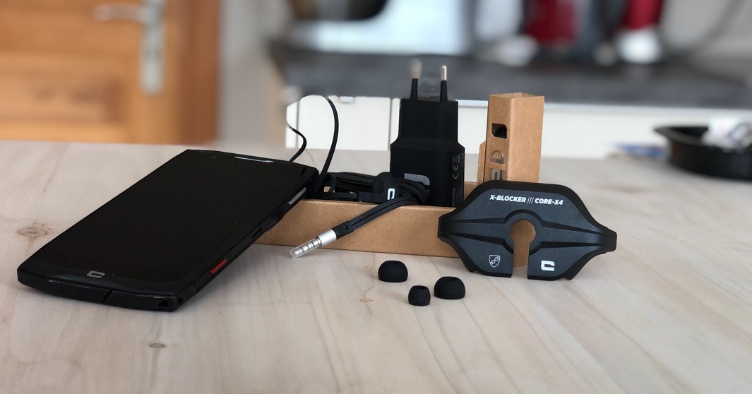 Déjà, c’est royal. Tout est emballé pico bello dans du joli carton et, ô surprise, il est fourni avec des écouteurs intra-auriculaires avec plusieurs embouts, un chargeur USB type-C, un tour de cou pour le suspendre… à votre cou (qui fait ça ?) et un “X-Blocker” qui vous permet de l’attacher éventuellement à un harnais de fixation vendu séparément.