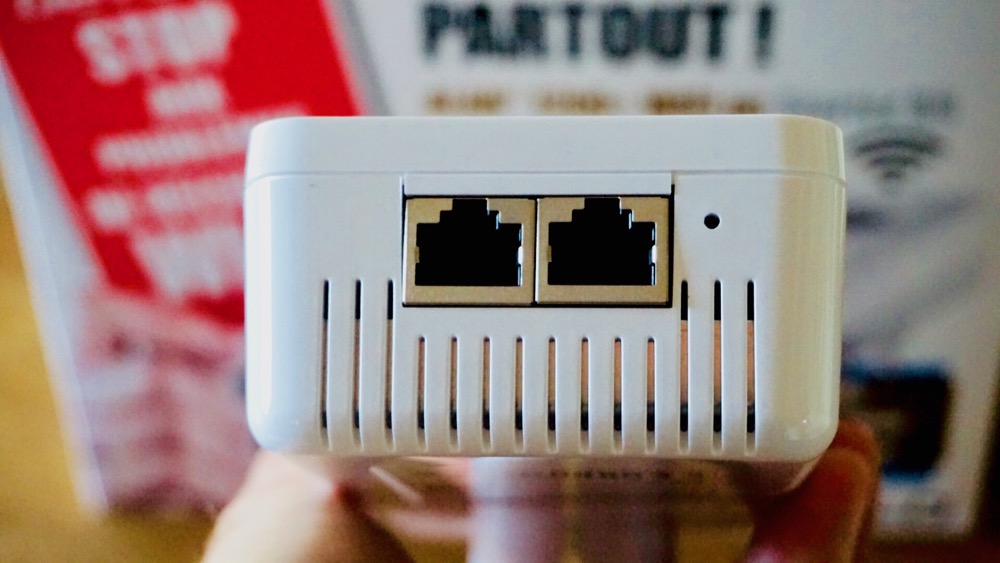 Grâce à devolo, je suis devenu, aux yeux de mon fils, un héro grâce auquel il pourra surfer avec un seul but en tête, faire ses devoirs studieusement assis à son bureau…! (Quoi ? on peut toujours rêver non ?) Vous trouverez en dessous du boîtier deux connecteurs Ethernet Gigabits qui vous permettront d’y pluger en filaire votre smart TV, console de jeux ou autres, après tout, vous êtes chez vous!
