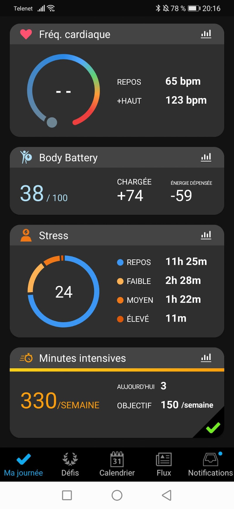 Hormis la course, la montre de Garmin est complète dans d’autres domaines. Elle permet de lire les notifications de toutes les applications (mais sans pouvoir y répondre), de voir les prévisions météo, d’observer le nombre de respiration/minute, de voir l’analyse de sommeil (sur ce modèle, dans l’application uniquement) et de son état de forme « Body Battery », selon un algorithme propre à Garmin ainsi que son état de stress. D’ailleurs, le fonctionnement de cette mesure a pu être validé après l’analyse de stress de Matyas pendant son examen de mathématique et lorsqu’il est allé chercher ses résultats de fin d’année quelques jours plus tard. On ne peut pas dire qu’il était très à l’aise pour son bulletin alors qu’il disait qu’il était confiant.