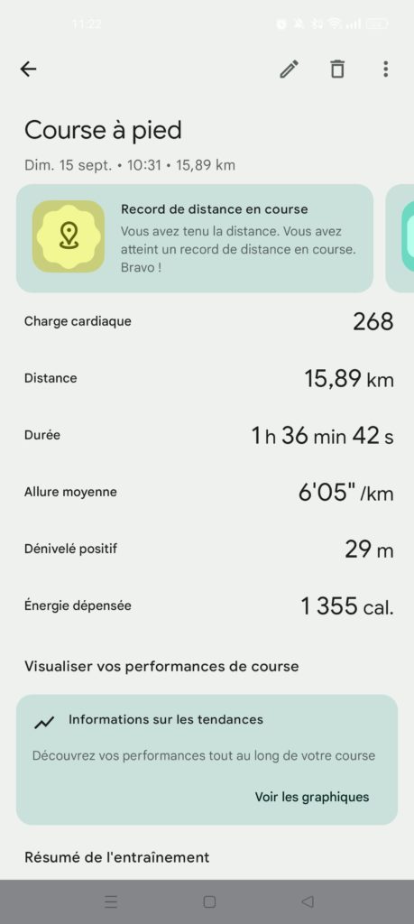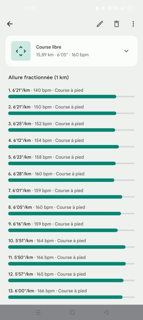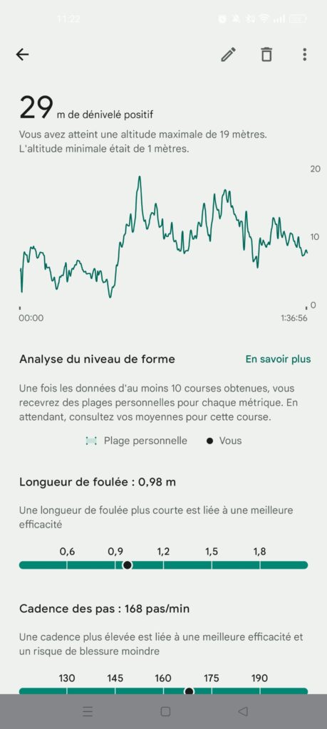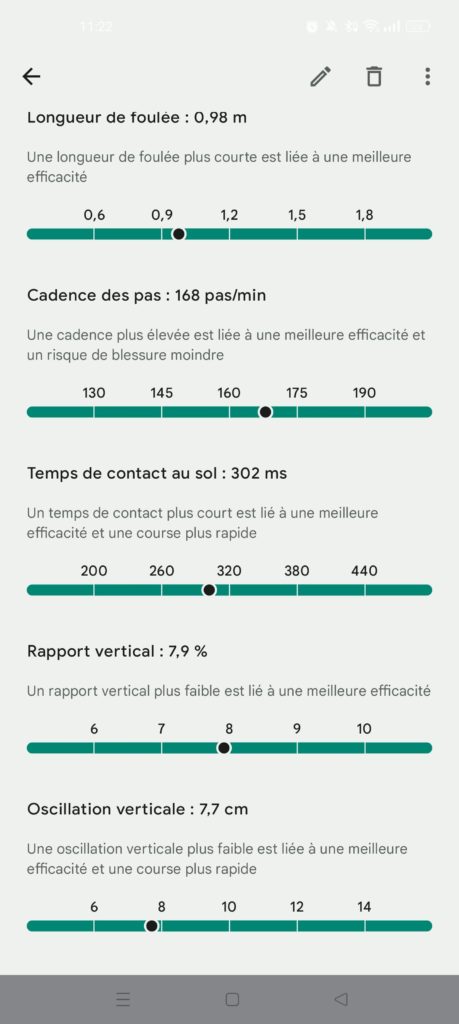 Quant aux autres statistiques (cadence des pas, longueur de foulée, oscillation verticale, rapport vertical, temps de contact au sol), les graphiques de la Google sont moins clairs que sur l’application de Garmin, mais les moyennes des séances sont étonnamment proches.