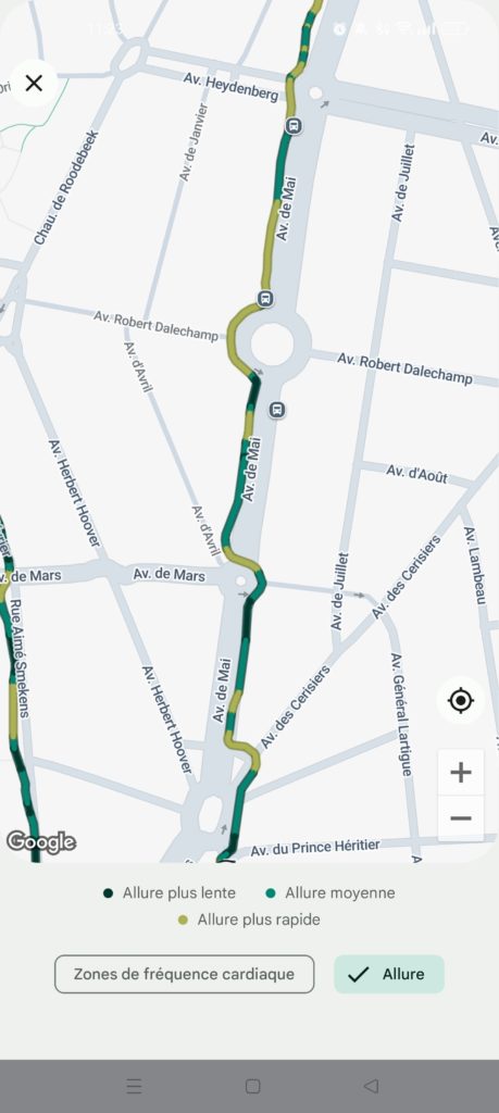 J’ai testé les montres en pleine ville, dans le centre de Bruxelles. Avec une sortie sur le trottoir côté rue, et une autre en longeant les maisons pour un test plus extrême. Ici, la Garmin, avec son GPS multi-bandes, s’en sort évidemment mieux. Toutefois, la Pixel Watch 3 ne démérite pas avec des écarts de tracé minime de 2-3 mètres. J’ai “traversé” quelques bâtiments lors des virages mais rien de catastrophique. La différence de distance parcourue entre les deux montres était inférieure à 1 %, ce qui est un résultat excellent pour une montre qui n’est pas spécialement conçue pour la précision du GPS.