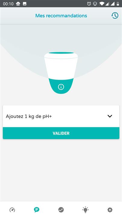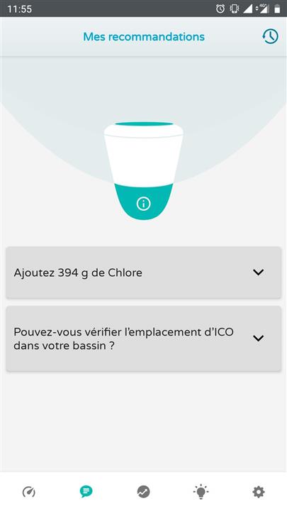 Maîtrisant bien l’équilibrage d’une piscine, votre dévoué entreprît de rétablir partiellement l’équilibre tout en laissant venir ICO. Quelques mesures plus tard, ICO, l’ange gardien des héritières de la famille (nouveau nom de baptême), a commencé à fournir quelques conseils très à propos. L’application (on adore cette fonctionnalité) ne s’arrête pas aux mesures, elle donne même des ordres (NDLR : des conseils 😊) et quantifie l’intervention de manière assez précise.