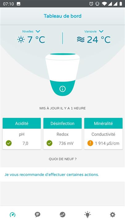 Quelques courtes minutes après son immersion, ICO enregistrait, d’abord pour lui uniquement, les données clés d’une eau de piscine et les fournissait à l’application dès sa première connexion au Wifi de la maison :