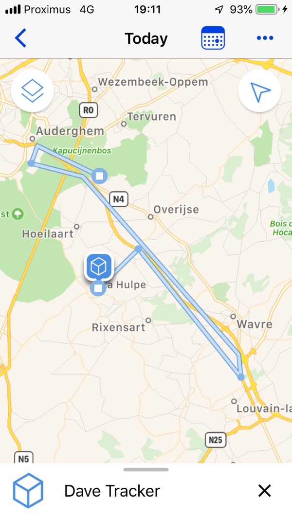 Bon, dix minutes c’est long pour le sportif de haut niveau que je suis et qui a l’habitude de monitorer le parcours détaillé de ses entrainements intensifs depuis sa montre GPS. C’est qu’en dix minutes, on peut en faire des kilomètres en course en pied… et puis j’ai aussi décidé de le tester en forêt. Je passe donc très rapidement à la vitesse supérieure et opte pour le mode tracking toutes les cinq minutes. Et oui, il faut de l’action, pas du temps-réel certes, mais au moins du léger différé ! Mais pour le coup il faut préciser que ce tracker autonome n’a pas pour vocation de suivre votre sortie en jogging ou en vélo même s’il est néanmoins possible d’afficher des parcours sur la période de votre choix. Hélas, je ne peux partager ici tous mes itinéraires car ma femme pourrait éventuellement y retrouver le compte-rendu de toutes mes sorties, mais voici tout de même un exemple d’affichage de parcours: