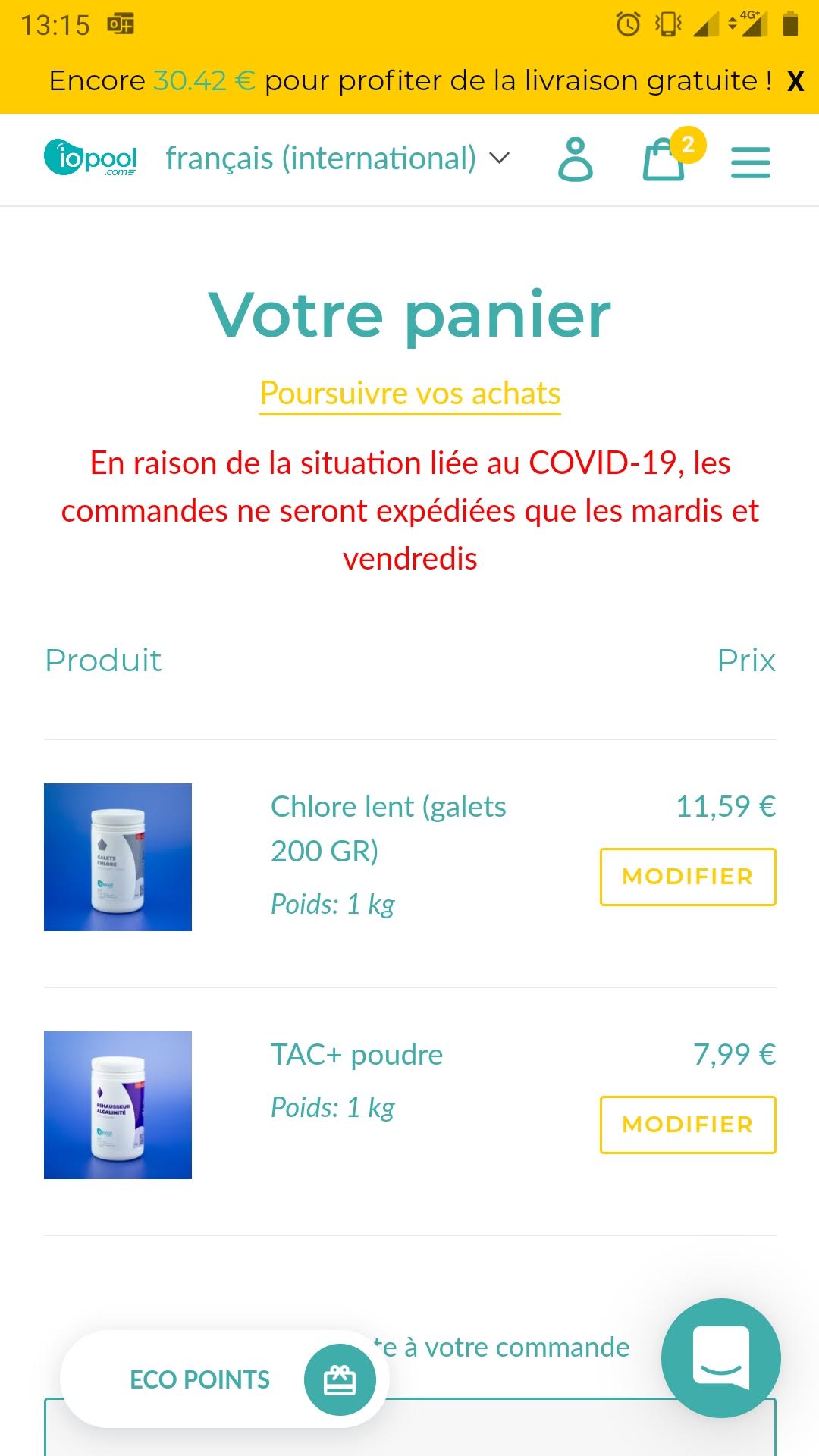 C’est encore impressionné par la rapidité et la précision des chiffres (comparés au titrage) que nous sommes définitivement conquis par le service « UBERPOOL ». En effet, l’application nous propose immédiatement une liste d’actions à exécuter via l’ajout de produit et l’adaptation de la filtration de la piscine mais pas que… Elle nous informe que nous ne disposons pas de tous les produits nécessaires et propose un lien direct vers la boutique de IOPOOL. Les mauvaises langues pourraient penser à un vendor-locking, nous parlons ici d’un service à valeur ajoutée qui après comparaison est meilleur marché de la fourniture de produits d’autres marques du marché, pourvu que ça dure…