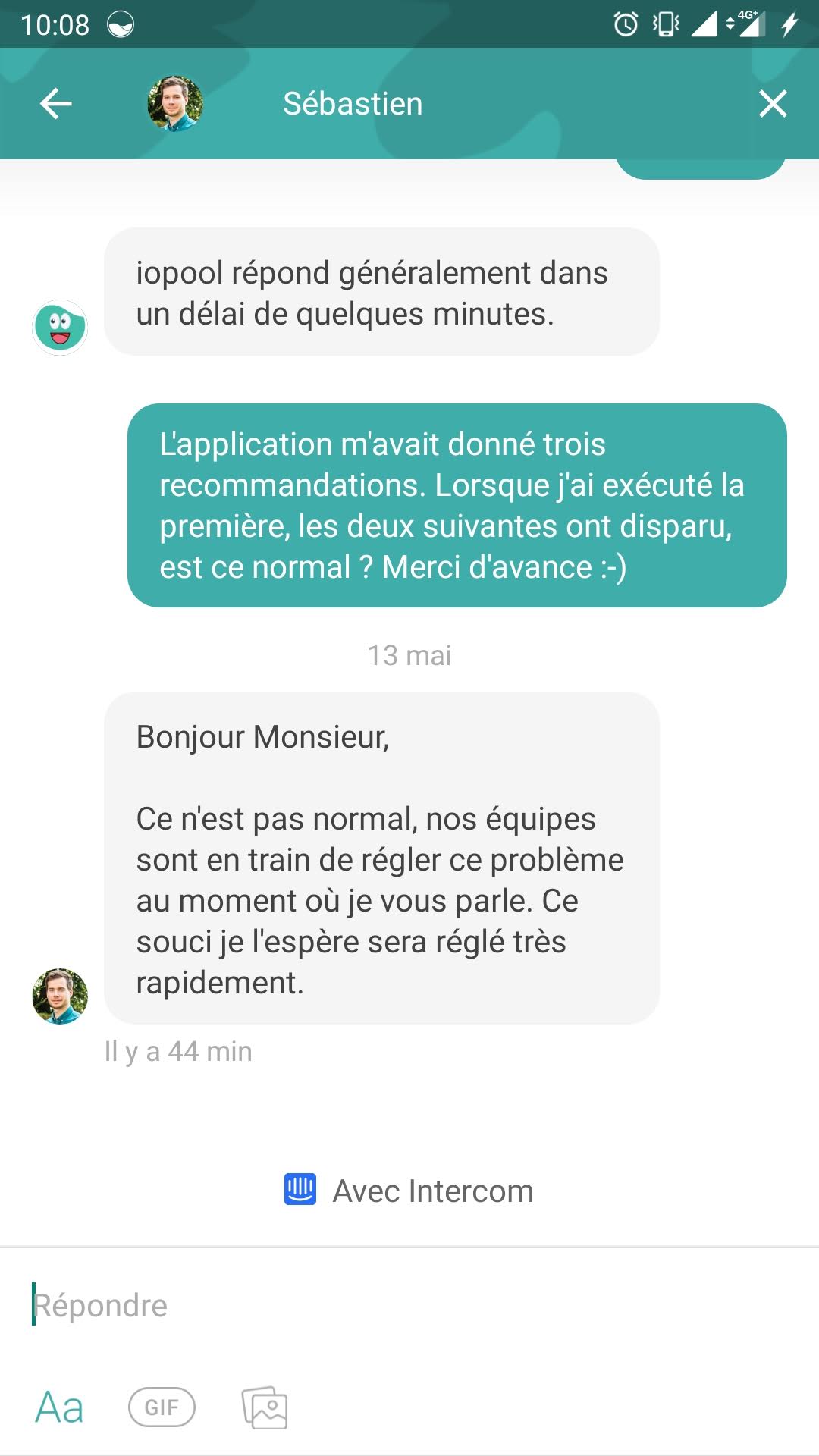 Plus tôt dans cet article, nous vous parlions d’une entreprise dynamique, cette affirmation sera vérifiée au travers de deux expérience utilisateurs remarquables. Tout d’abord lors du suivi des recommandations, nous avons constaté qu’un bug était présent dans l’application, rien de bien grave mais notre background d’ITer nous a donc amené à tester le support. Impressionnante efficacité constatée lorsque à peine le souci enregistré, nous recevions déjà un message de l’équipe de support.