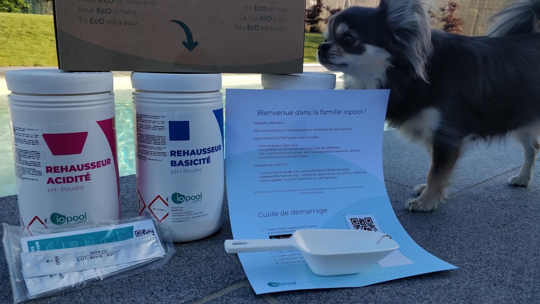 Dans son offre de base, IOPOOL propose un kit starter composé de ECO et des trois produits d’entretien de base pour la piscine, le traditionnel Chlore Choc, du PH+ et du PH-. De plus, le colis contient également un précieux doseur (ça semble idiot mais au combien important, voir plus loin dans le test) et des languettes de titrage.