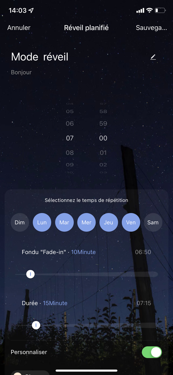 Pour la problématique du réveil d’Olivia, grâce à l’option “Réveil planifié”, il est possible de transformer la Konyks Antalya en réveil à simulateur d’aube. J’ai ainsi pu programmer l’ampoule pour qu’elle commence à s’allumer à 6h50 pour atteindre l’intensité maximale à 7h. Je peux également paramétrer le temps de répétition (dans mon cas, uniquement les jours d’école), la durée d’allumage (2h max), la couleur (la température de blanc réglable de 2700K à 6500K) et l’intensité souhaitée (jusqu’à 806 lumens, ce qui est très lumineux).