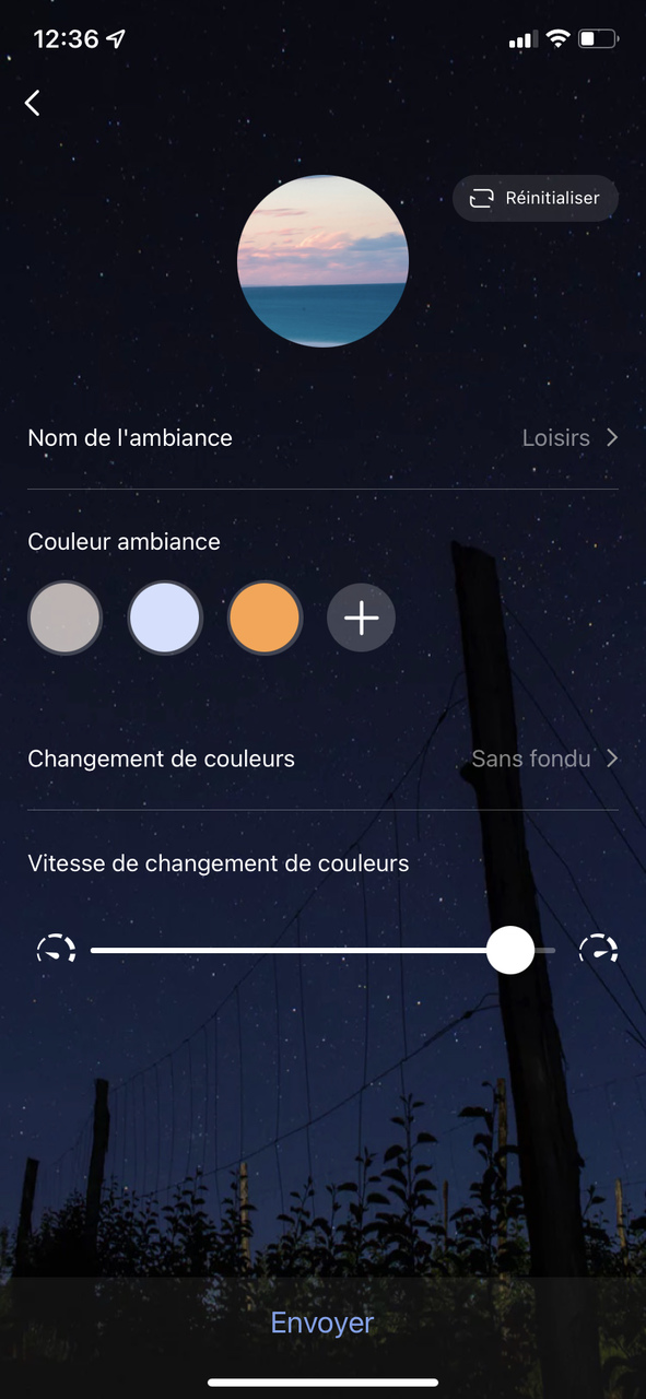 L’application offre beaucoup avantages ; deux qui me paraissent plus « gadget » que vraiment utile, qui sont l’intensité selon quatre ambiances (bonne nuit, lecture, travail, loisir) et la fonction changements de couleur à une vitesse prédéfinie.